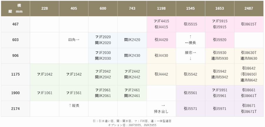 一条工務店の窓サイズ表を作ってみました。(Jサッシ)